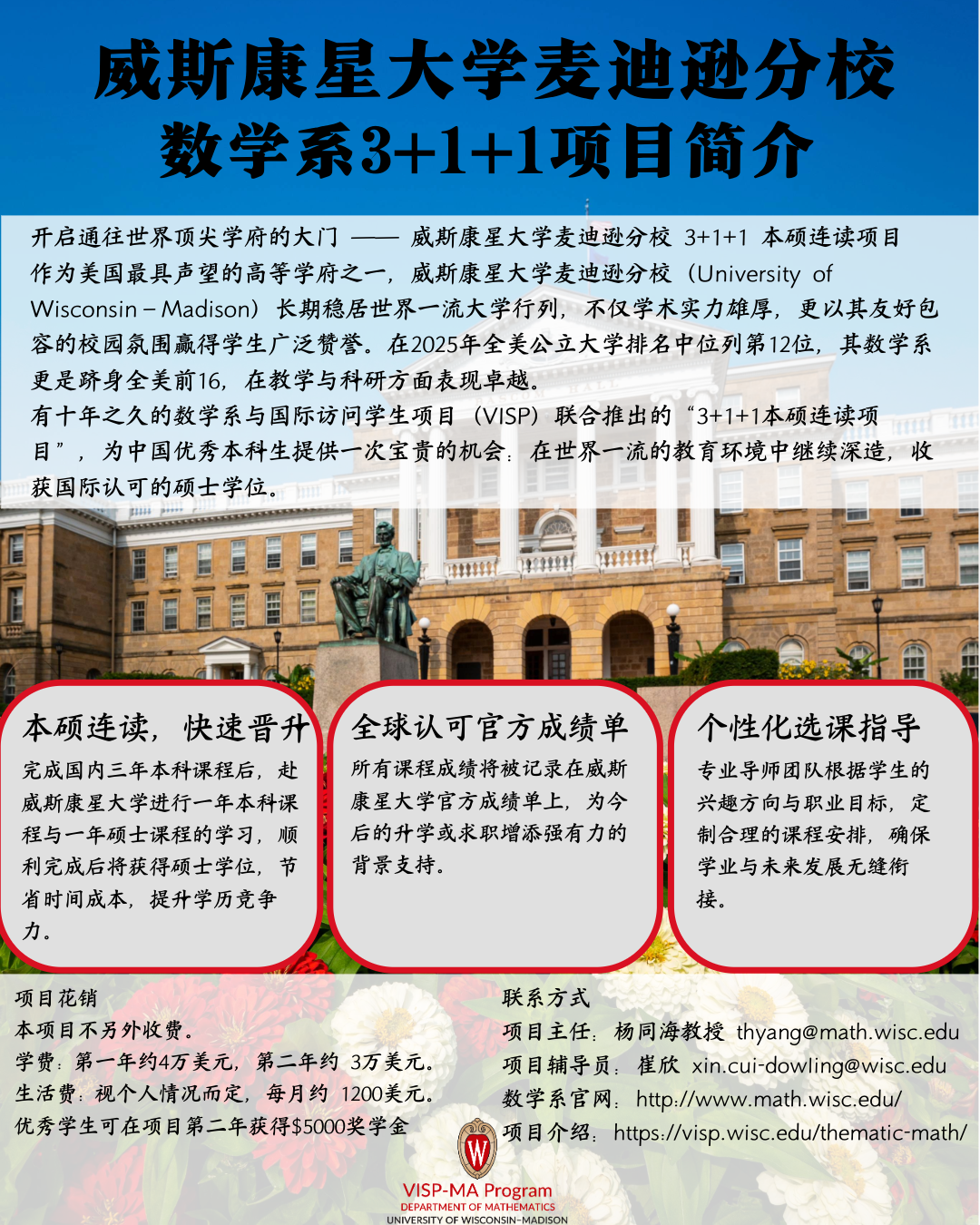 2022年以来,南科大数学系与美国威斯康星大学麦迪逊分校(UW-Madison)文理学院数学系“3+1+1”本硕联合培养项目已经顺利开展四届。被录取学生将在本科第四学年前往威斯康星大学麦迪逊分校参加VISP学期项目,修读一年本科课程,课程学分转回南科大,完成毕业答辩并满足毕业要求后获得南科大学士学位。