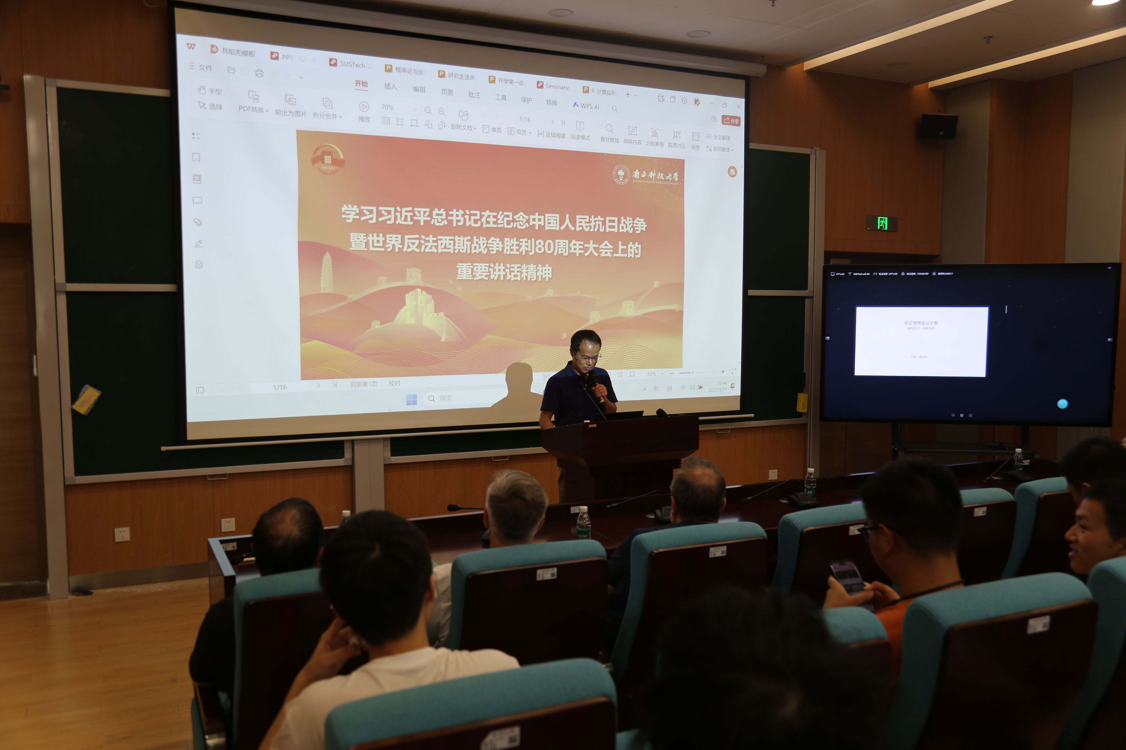 杨将带领同学们学习了习近平总书记在纪念中国人民抗日战争暨世界反法西斯战争胜利80周年大会上的重要讲话精神。他表示,和平来之不易,铭记历史方能开创美好未来。同时,他对同学们提出了“科技报国”的殷切希冀。